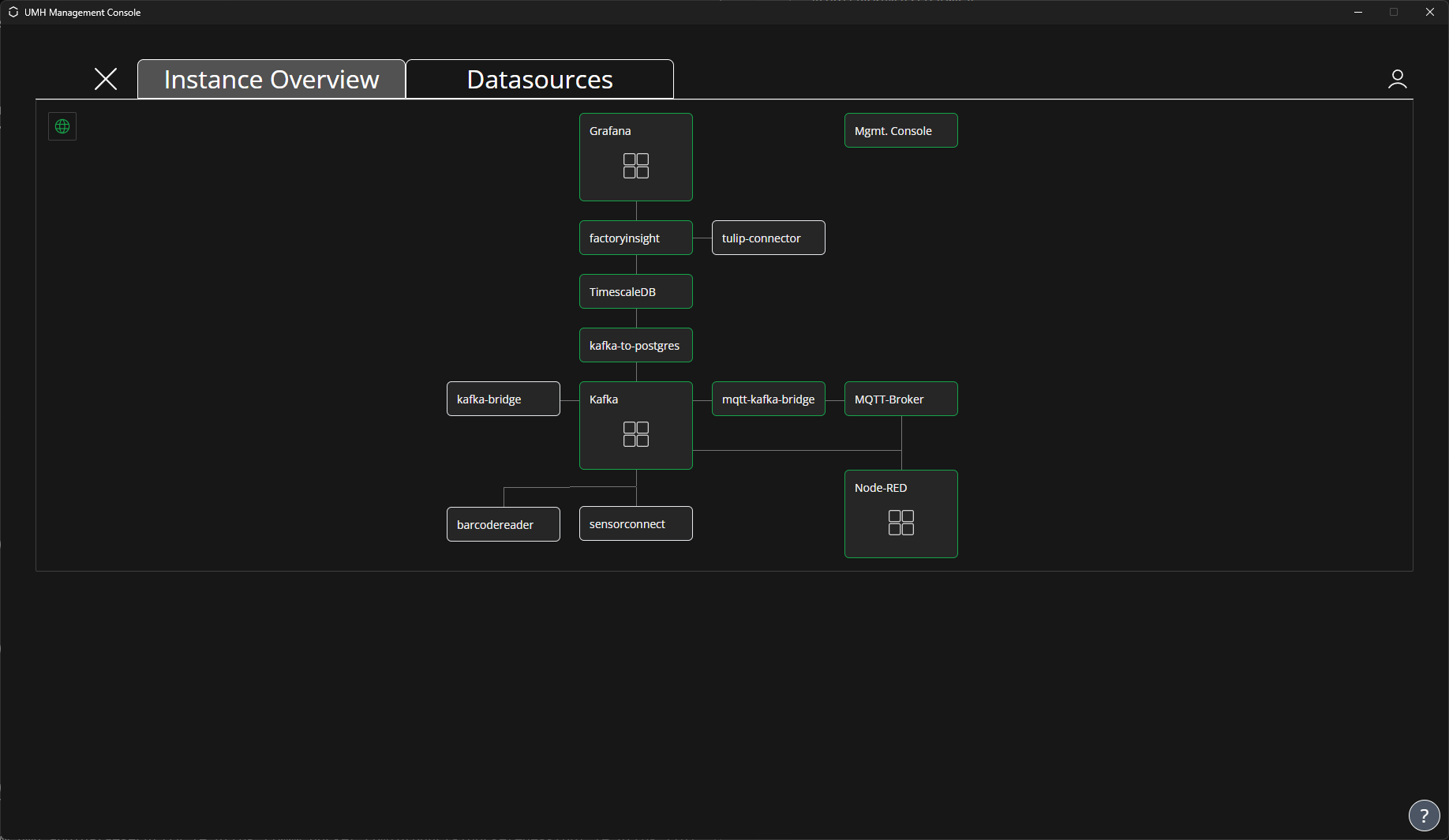 - Once the Management Console looks like in the picture below, you can continue with the tutorial. The device tree displays the different microservices that make up the UMH instance.